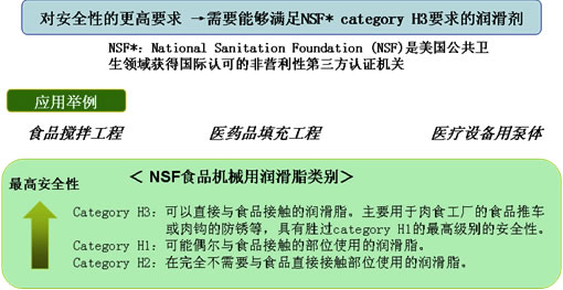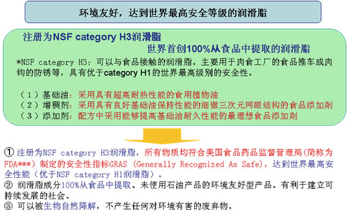 **category H3:可以直接與食品接觸的潤滑脂。主要用于肉食工廠的食品推車或肉鉤的防銹等,具有勝過category H1的最高級別的安全性。category H1是可能偶爾與食品接觸的部位使用的潤滑脂。