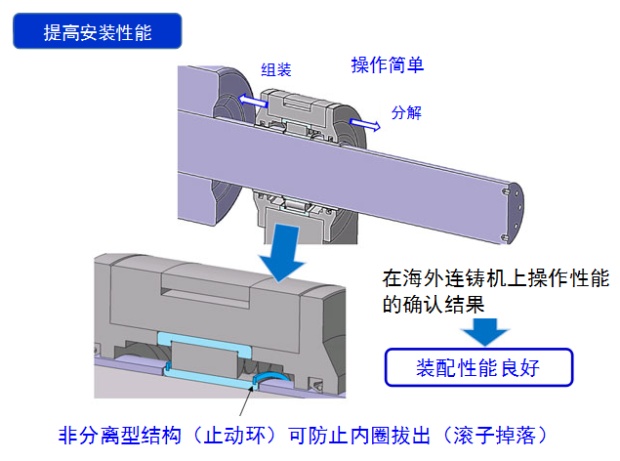 連鑄機是把高溫鋼水連續不斷地澆鑄成具有一定斷面形狀和尺寸的鑄坯的生產設備,它的導輥部位軸承使用量非常巨大。現在鋼鐵廠都要求設備穩定運行,進而通過提高生產效率及延長維護周期來實現削減維護成本,這樣,便對連鑄機導輥用軸承提出更高要求:壽命長、可靠性高(避免突發損傷)。但導輥用軸承在重載及極低轉速的條件下運行,同時被冷卻水及水蒸汽包圍,潤滑條件極其惡劣。因此,包含新興國家在內的海外連鑄機用軸承均存在因磨損引起的早期損傷問題。NSK主要針對海外連鑄機導輥如何實現削減維護成本研發了本產品,成功解決了這一難題。