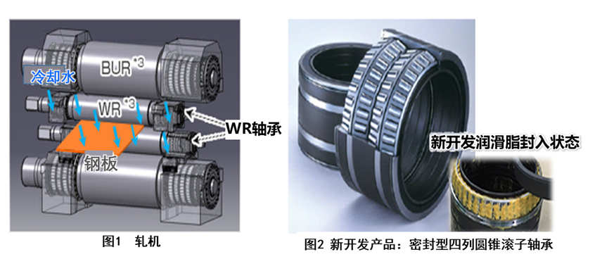 冶金設備軋機工作輥用軸承(圖2)的工作環境異常苛刻,不僅要在高速運行中承受重載,而且還要忍受高溫、水及鐵粉的侵入。特別是冷卻水侵入軸承內部后,可導致潤滑不良并出現早期損傷(剝落*2、咬粘、銹蝕等)。為了解決這些問題,NSK將密封設計及將水侵入的惡劣影響降至最小化的潤滑脂技術相結合,開發了新產品。
