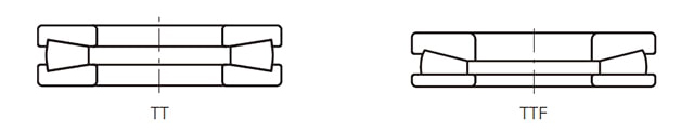 使用圓錐滾子的推力軸承,TT型軸承的座圈上帶有擋邊,徑向方向精確固定。TTF型軸承座圈上沒有擋邊,允許運轉過程中有一定的偏心。