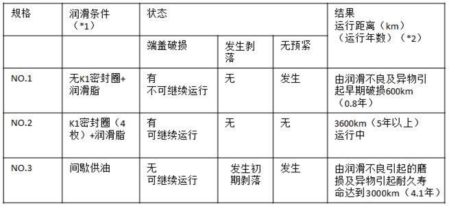- (*1): 脂在實驗中不補給樣品No.1、2的封入潤滑。
